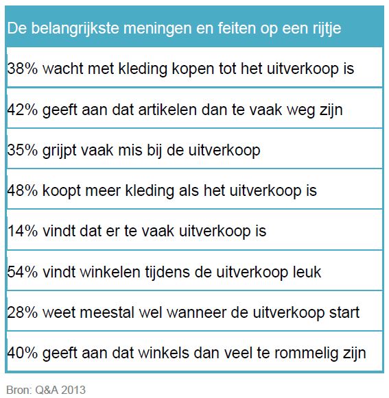 Uit onderzoek van ABN AMRO onder 1.300 consumenten blijkt dat 80% nog wel één of meerdere kledingstukken wil kopen. Bijna 40% wacht hiervoor echter op de uitverkoop. Hoewel de uitverkoop een periode is waarin de consument ook vaak misgrijpt, vindt 54% winkelen tijdens de uitverkoop leuk en koopt 48% dan meer artikelen. Ook koopt 36% eerder duurdere kleding in de uitverkoop en krijgen zij zo in hun perceptie meer waar voor hun geld. De meeste consumenten blijven loyaal aan 'hun' winkel: slechts 21% geeft aan tijdens de uitverkoop voor een andere winkel te kiezen.