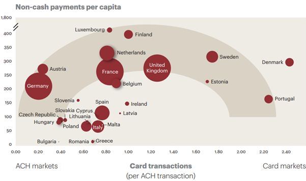 De consultants verwachten dat alle Europese markten een stijging zullen meemaken. De mate van groei zal desalniettemin verschillen, en is volgens de adviseurs voor een groot deel afhankelijk van de marktstructuur van de betalingsmarkt binnen het land. A.T. Kearney schat in dat groei hoger zal liggen in markten die een goede balans hebben tussen ACH* en betaalkaarten. Op dit vlak scoort Nederland goed – ons land kent na Luxembourg en Finland het hoogste aantal elektronische betalingen per inwoner. Gemiddeld genomen doet een Nederlander jaarlijks bijna 350 elektronische transacties, wat neerkomt op 44% van de circa 800 betalingen die een gemiddelde consument jaarlijks uitvoert.