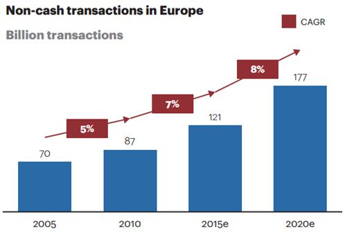 De Europese betalingsmarkt wordt momenteel geschat op circa €44 miljard. De komende jaren groeit de markt met een samengestelde jaarlijkse groei (CAGR*) van tussen de 6% a 7%, met als gevolg dat de markt in 2020 zal zijn toegenomen tot €65 miljard. Aan de basis van de sterke groei ligt de grote stijging van het aantal elektronische transacties, gestuwd door de toenemend populariteit van e-commerce.