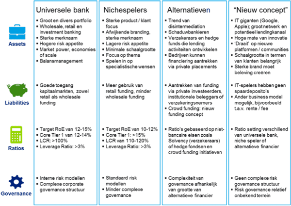 Het raamwerk zoals hieronder opgenomen bevat vier profielen: universele banken, niche banken, alternatieve financiers inclusief banken binnen verzekeraars en nieuwe concept banken. Deze vier profielen zijn uitgewerkt aan de hand van karakteristieken zoals omvang, focus, merknaam en innovatie.