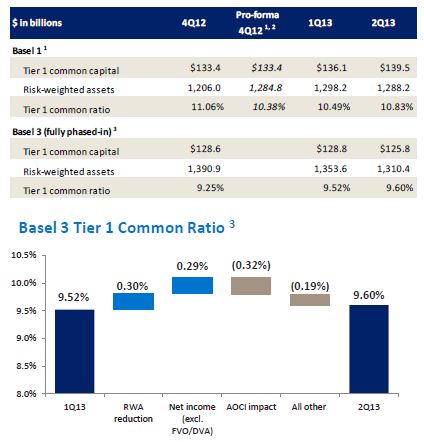 Het afgelopen kwartaal heeft Bank of America haar kapitaalpositie weten te verbeteren. Haar tier 1 kapitaal kwam uit op $125,8 miljard met als gevolg dat haar Basel 3 kapitaalratio steeg van 9,52% in het eerste kwartaal van dit jaar naar 9,6% in het tweede kwartaal.