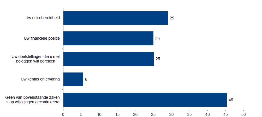 Beleggingsadviseurs en vermogensbeheerders controleren vaak niet op wijzigingen in de persoonlijke situatie van de klant. Dit terwijl deze wijzigingen grote gevolgen kunnen hebben op de haalbaarheid van het beleggingsdoel. Bij 45% van de consumenten die via een beleggingsadviseur of vermogensbeheerder belegt, zijn het afgelopen jaar persoonlijke gegevens niet op wijzigingen gecontroleerd. Dit blijkt uit onderzoek van de Autoriteit Financiële Markten (AFM) onder 465 beleggers, uitgevoerd door GfK. De AFM roept alle adviseurs en beheerders op om goed op de hoogte te blijven van de persoonlijke situatie van klanten.