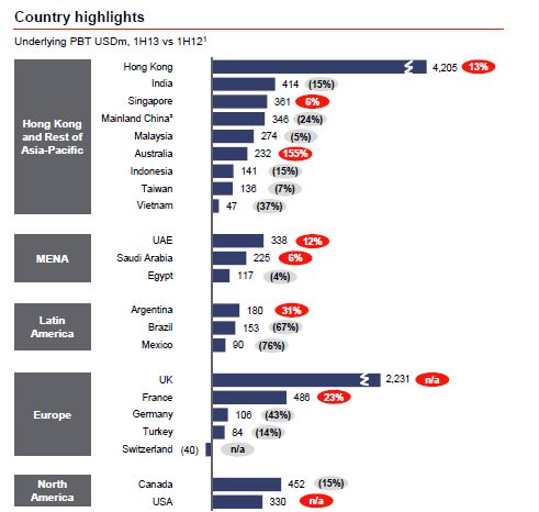 Stuart Gulliver, CEO van HSBC, benadrukte dat de bank zich zal blijven terugtrekken uit landen waar het onvoldoende schaal heeft. Daarnaast zet de bank in op groei van haar activiteiten in opkomende markten en het implementeren van wereldwijde standaarden en gestroomlijnde processen.