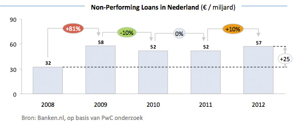 In 2008 bedroeg het totaal aan NPL’s bij Nederlandse banken €32 miljard. Als gevolg van de crisis verkregen kredieten in snel tempo de status van ‘non-performing’, waardoor het totaalbedrag tussen 2008 en 2012 is geëxplodeerd. Anno 2013 heeft de bancaire sector in ons land gezamenlijk €57 miljard aan dubieuze leningen uitstaan in de maatschappij.