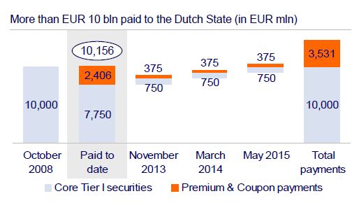 Van de totale kapitaalinjectie van €10 miljard is volgende week €8,5 miljard terugbetaald met daar bovenop €2,8 miljard aan rente en premies. Tot nu toe is in total €10,156 miljard aan de Nederlandse staat betaald.