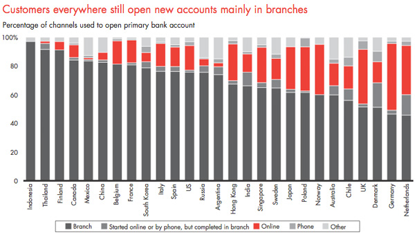 Kijkend naar het totale aantal interacties met een bank – waaronder bijvoorbeeld verkoopgesprekken en ook klantenservice – laat Nederland ook een hoge digitaliseringsscore zien. Bijna 50% van alle interacties vindt online plaats. Wat opvalt is dat in Nederland een relatief hoog percentage van intersecties via de smartphone plaatsvindt, wat herleid kan worden naar de hoge penetratie van smartphones in Nederland en de hoge volwassenheid van bankier-apps. Interessant is dat er wereldwijd, relatief gezien, nog maar weinig interacties plaatsvinden via de telefoon of op kantoor. Ook opvallend te noemen is het feit dat in Japan bijna 50% van alle interacties via geldautomaten verloopt.