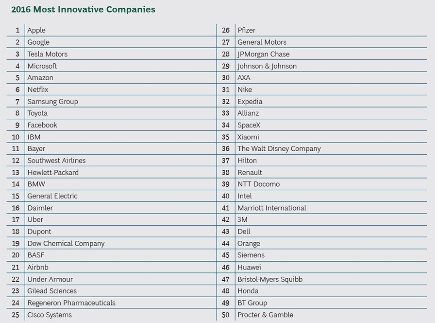 Volgens innovatiemanagers en -bestuurders is Apple in 2016 wederom het meest innovatieve bedrijf. De elektronica- en tech-gigant staat al ruim 5 jaar op de eerste plek in de lijst. Google pakt opnieuw de tweede plek, terwijl de derde plek in 2016 naar Tesla Motors gaat. De rest van de top tien bestaat uit #4 Microsoft, #5 Amazon, #6 Netflix, #7 Samsung Group, #8 Toyota en Facebook en IBM op respectievelijk de 9e en 10e plek.