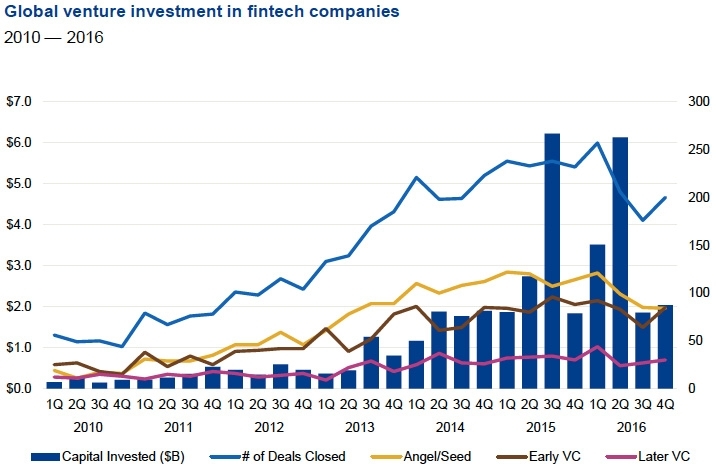 Ondanks de daling van de wereldwijde investeringen in FinTech, namen de investeringen van durfkapitalisten in 2016 licht toe. ‘Angels’, private equity partijen, mutual funds en hedge funds hebben in 2016 voor een bedrag van $13,6 miljard geïnvesteerd in FinTech-bedrijven, $0,9 miljard meer dan in 2015. Wel daalde het aantal transacties van 941 naar 839 in 2016. De lichte stijging in 2016 is te danken aan de grootste durfinvestering van vorig jaar, die in het Chinese Ant Financial voor een bedrag van $4,5 miljard.