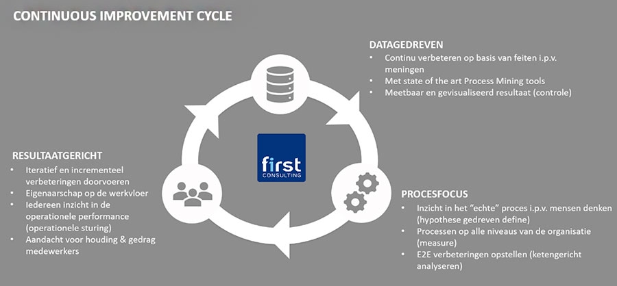 Process Mining geeft de mogelijkheid om het daadwerkelijke proces te laten zien en te ervaren. De waarde hiervan is veel groter. Het geeft de mogelijkheid om met elkaar het proces continu te doorgronden en te verbeteren. De resultaten van aanpassingen zijn meteen inzichtelijk. Het geeft ruimte om te experimenteren: wat is het commerciële resultaat als we groep A benaderen op manier X en groep B benaderen op manier Y? Ook wordt duidelijk welke afdelingen of collega’s extra training/ondersteuning nodig hebben om de performance verder te verbeteren. First Consulting ziet de kracht van Process Mining dan ook als middel om continu te verbeteren. Dit doen we door drie principes toe te passen: