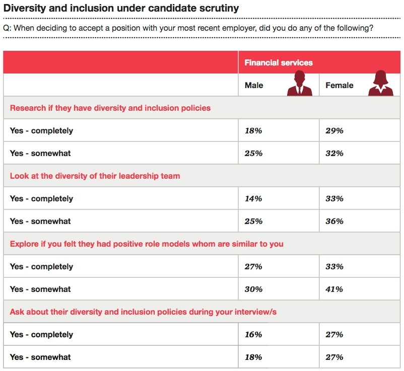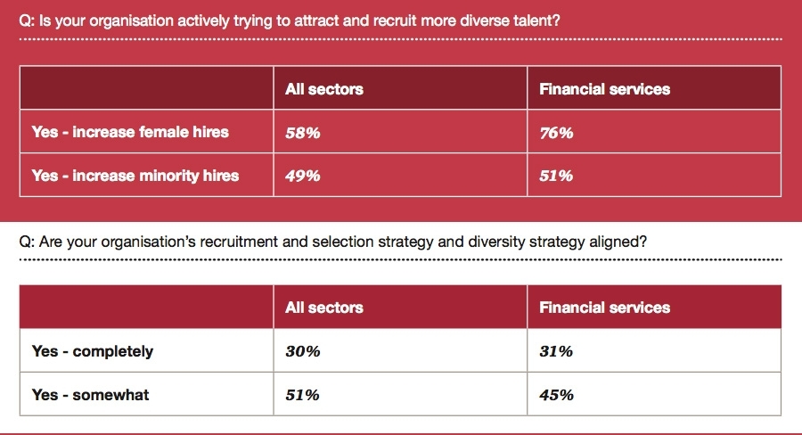 Volgens het rapport zijn bedrijven in toenemende mate op zoek naar diversiteit en ligt de focus daarbij vooral op het aantrekken van meer vrouwen. Over alle sectoren is 58% van alle bedrijven op zoek naar meer vrouwen en 49% specifiek op zoek naar minderheden. De financiële sector zit daar in beide categorieën boven, zowel bij vrouwen (76%) als bij minderheden (51%).