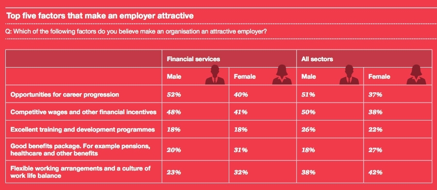 Het rapport heeft ook aandacht voor de kandidatenzijde van het wervingsproces, in de vorm van welke factoren een potentiële werkgever aantrekkelijk maken. Ook hier zijn vergelijkbare parallellen te trekken tussen financiële bedrijven en alle sectoren. Wel zitten hier en daar opvallende verschillen tussen mannen en vrouwen. Mannen vinden carrièreperspectief en salaris belangrijker, waar vrouwen meer oog hebben voor secundaire arbeidsvoorwaarden en werk-privébalans.