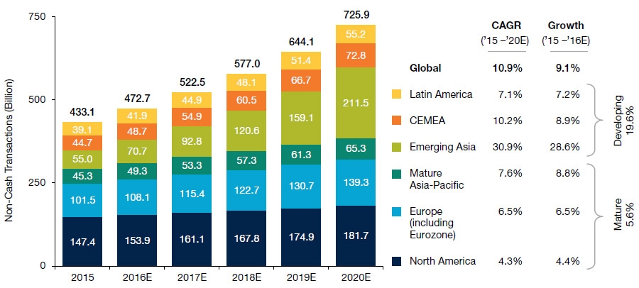 Het aantal elektronische betalingen wereldwijd groeit harder dan ooit te voren. Dat blijkt uit het World Payments Report 2017 van Capgemini en BNP Paribas. Naar verwachting groeit het aantal betaaltransacties met betaalpassen of andere elektronische betaalmiddelen de komende jaren verder tot een totaal van bijna 726 miljard transacties wereldwijd.