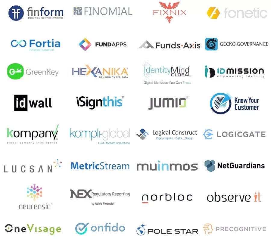 Governance.io, Advanced logic analytics, Agreement express, Alyne, Surety, Appzen, Aqmetrics, Arachnys, Ascent, Behaviosec, Bigcontrols, Regbot, Capnovum, Cappitech regulations, ChekRecipent, ClauseMatch, Cloud9, Compendor, ComplyAdvantage, Contego, Corlytics, CoVi Analytics, Cube, Cxi, Cynopsis solutions, Datarama, Dathena, Digital control room, Digital reasoning, Dome 9, Duedil, Dynamic GRC, EastNets, Electronic iDentification, Encompass, Fenergo, FinForm, FinoMial, FixNix, Fonetic, Fortia, FundApps, FundsAxis, Gecko Governance, Greenkey, HexaNika, Identity Mind Global, IDmission, ID wall, iSignthis, Jumio, Know your customer, Kompany, Kompli-global, Logical construct, Logicgate, Lucsan, MetricStream, Muinmos, NetGuardians, Neurensic, Nex regulatory reporting, Norbloc, Observe it, Onevissage, Onfido, Polestar, Precognitive, Quantexa, Quarule, Qumram, Recordsure, Regit, Regtek, REGtify, Reportin, Riskifier, Scaled Risk, SecondFloor, Signaturit, Skyhigh, Smartsearch, Spitch, Sybenetix, Synacts, Taina technologies, TheMarketTrust, ThisIsMe, Tokken, Touchtech payments, Trappets, Trax Print, Trunomi, Vatbax, Vestwell, VigilantCS, VoxSmart, W2, WaymarkTech, Trulioo