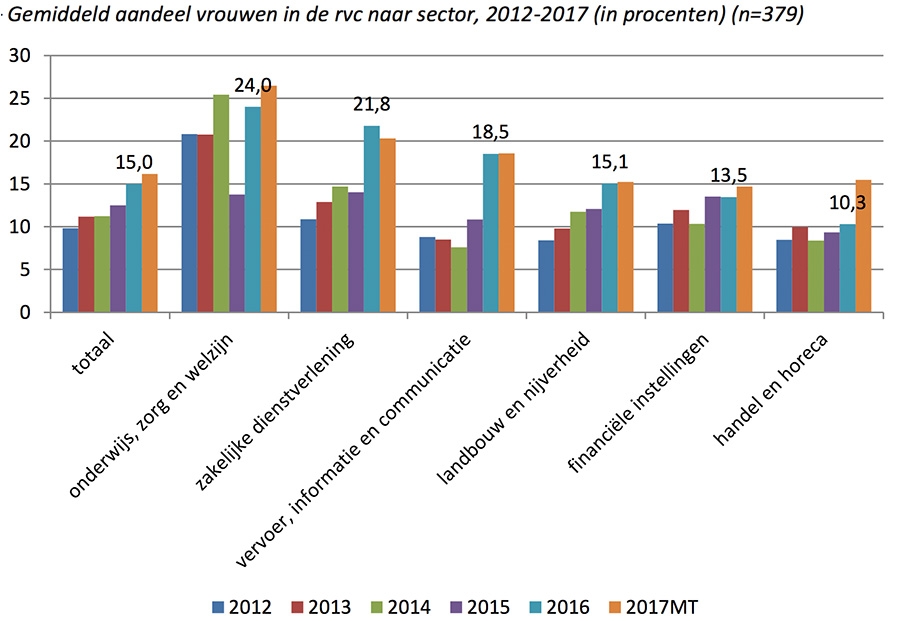 Gekeken naar diverse sectoren waarin de onderzochte bedrijven actief zijn, blijken er weinig grote verschillen te zijn tussen de branches. Alleen de sector onderwijs, zorg en welzijn springt er in positieve zin uit met 22,3% vrouwen in de RvB's en 24% vrouwen in de RvC's. De financiële sector presteert met 11,8% vrouwen in de RvB's en 13,5% vrouwen in de RvC's ongeveer gemiddeld. Wanneer de vijf grootste banken er echter worden uitgelicht, komt naar voren dat zij het over het algemeen wel veel beter doen dan de rest van de sector en het overige Nederlandse bedrijfsleven.