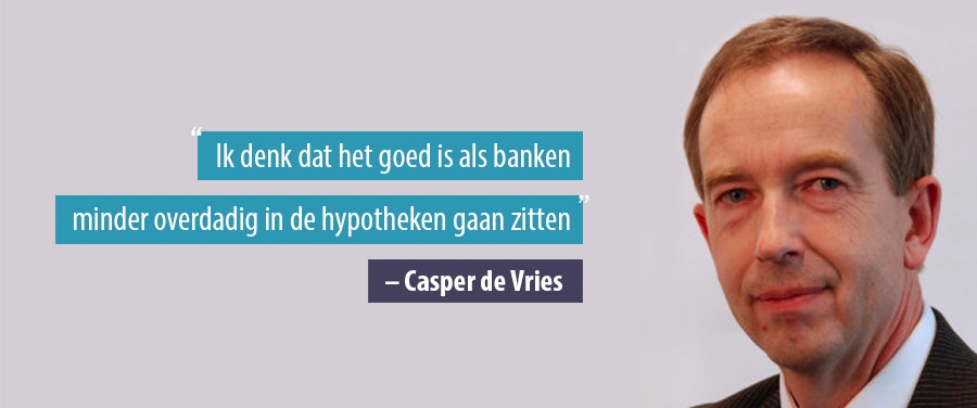 "Ik snap dat Nederlandse banken moeite hebben de zware kapitaaleisen van Basel 4. Want door de strenge Nederlandse wetgeving bieden hypotheken een grote mate van zekerheid", aldus hoogleraar monetaire economie Casper de Vries. Toch juicht De Vries het toe dat Nederlandse banken bezig zijn met een natuurlijke afbouw van hun hypothekenportefeuille.