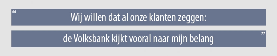 De nieuw hervonden relevantie wordt door elke bank weer anders ingevuld. Voor de Volksbank betekent het: onderscheiden op gedrag. En dat betekent keuzes maken, weet Baas. “Wij gaan ons niet onderscheiden op technologie, de laagste prijs of de nieuwste producten. In plaats van ons rendement te maximaliseren, investeren we in de klant, de maatschappij en de medewerker. Bankieren met de menselijke maat houdt bij ons in – en dat is makkelijker gezegd dan gedaan – dat wij in Nederland bekend komen te staan als een bank die naast de klant staat. Als wij aan onze klanten vragen ‘Denk je dat de Volksbank primair naar jouw belang kijkt of alleen naar het belang van de bank?’, dan willen we dat al onze klanten zeggen: ‘Volksbank kijkt vooral naar mijn belang’.”