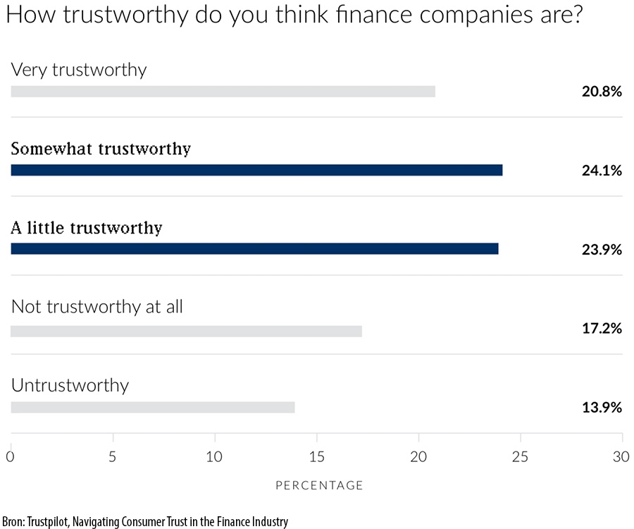 Meer dan de helft van de consumenten heeft weinig tot zelfs geen vertrouwen in traditionele financiële instellingen. Daarentegen is er veel vertrouwen in fintech-bedrijven. Bijna de helft beschouwt deze groep als zeer betrouwbaar. Deze uitkomsten komen voort uit een transnationaal onderzoek van online consumentenplatform Trustpilot.