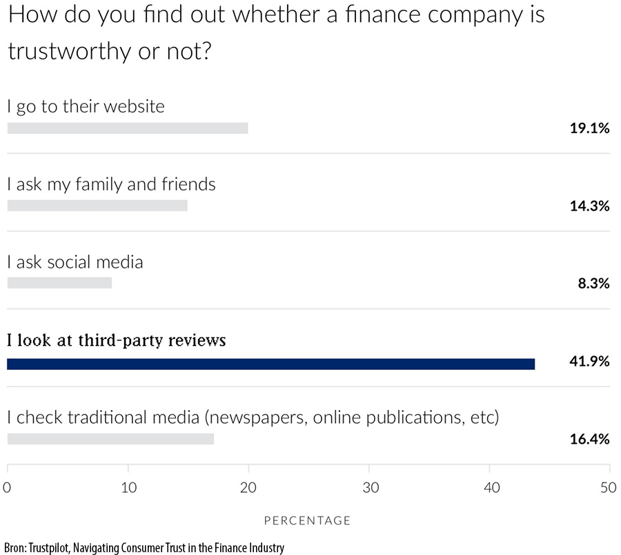 Waar komt vertrouwen vandaan en waarop baseren consumenten hun keuze om klant te worden? Het is misschien niet heel verrassend, maar reviews van derden vormen de belangrijkste reden voor 41,9% van de consumenten. Financiële bedrijven doen er dus goed om veel aandacht te besteden aan hun online reputatie. Het is natuurlijk wel van groot belang dat de ervaringen niet van ‘nepprofielen’ afkomstig zijn. Niet alleen worden argeloze consumenten daarmee benadeeld, mocht het uitkomen dat nepprofielen gunstige reviews geven, zal dat leiden tot ernstige reputatieschade. Of het bedrijf in kwestie er nu wel of niet van op de hoogte was.
