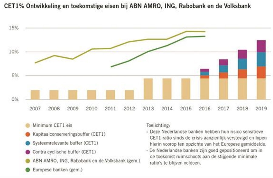De lichtgroene lijn die de vier grootste Nederlandse consumentenbanken weerspiegelt ligt duidelijk boven de donkergroene lijn van de gemiddelde bank in Europa. Vanaf 2016 is bovendien ook een extra buffer vereist als een bank tot de systeembanken wordt gerekend. De figuur loopt tot 2019, maar ook daarna staat er nog genoeg op de planning, onder andere met de invoering van Basel IV in 2022.