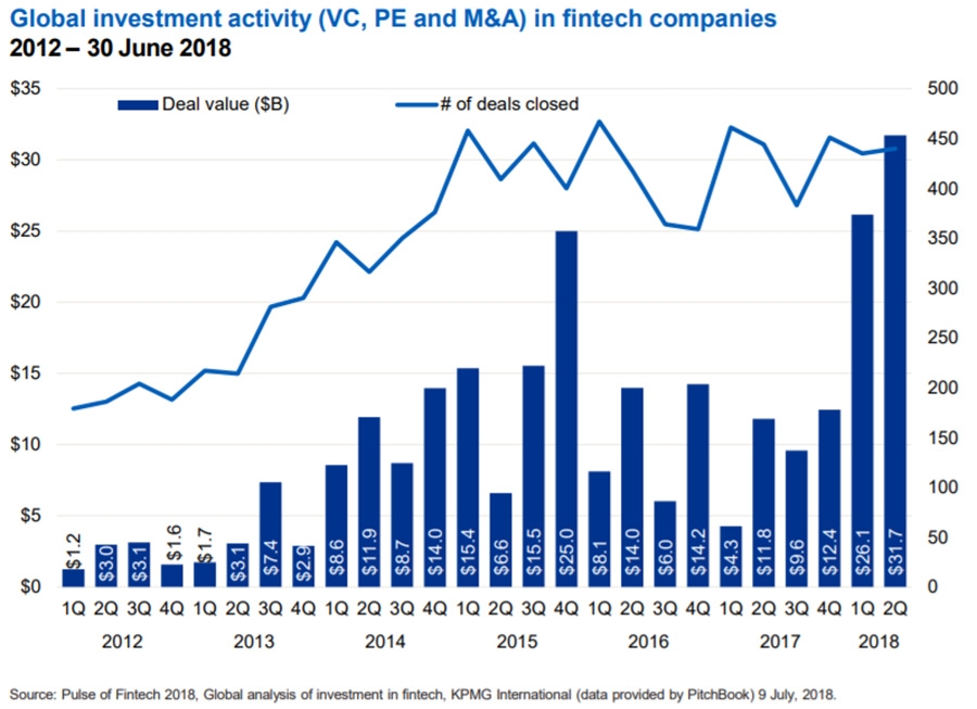 De tijd dat fintech synoniem stond aan creatieve ontwikkelaars die ergens op een zolderkamer een geniaal product in elkaar draaiden is lang voorbij. Fintech is ‘very big business’. Het eerste kwartaal van 2018 was met wereldwijde investeringen van $26 miljard al goed voor een record. Het tweede kwartaal van 2018 klapt daar met een totale investeringswaarde van $31 miljard nog eens vol overheen. Daarmee komt de totale investeringswaarde in fintech in het eerste halfjaar van 2018 wereldwijd uit op een duizelingwekkende $57 miljard. Ter vergelijking, in heel 2017 werd voor ‘slechts’ $38 miljard in fintech geïnvesteerd.