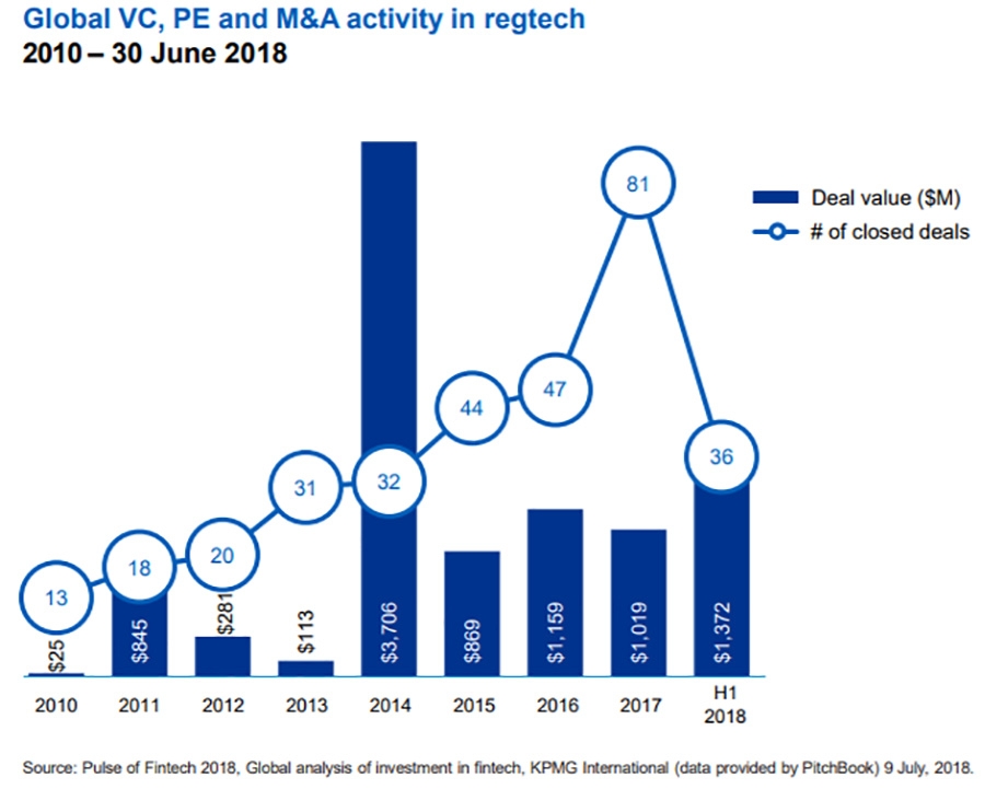 In de eerste helft van 2018 is wereldwijd voor $57 miljard in fintech geïnvesteerd, meer dan in heel 2017. Dat blijkt uit het onlangs gepubliceerde rapport ‘The Pulse of FinTech’ van advies- en accountantskantoor KPMG. Het bedrag is een optelsom van investeringen door private equity huizen, grote ondernemingen en fusies en overnames. Opvallend is dat er steeds meer aandacht komt voor regtech.