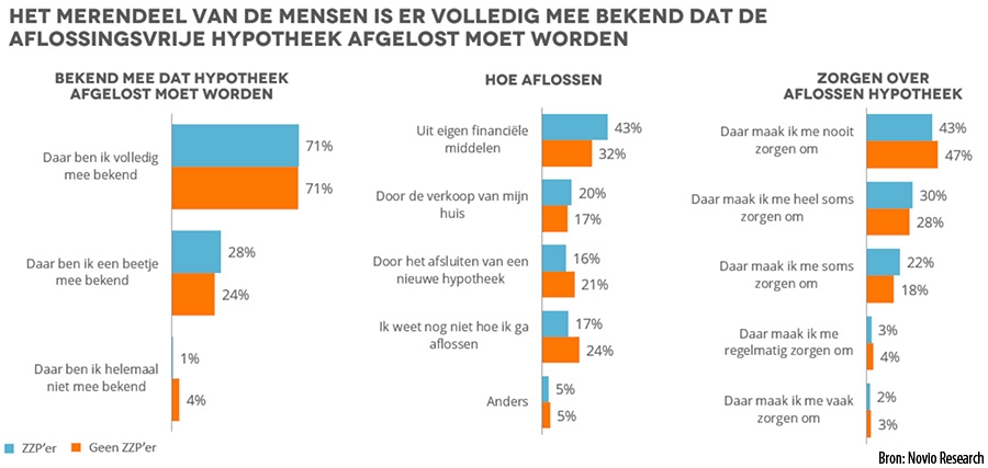 In opdracht van de Nederlandse Vereniging van Banken (NVB), heeft Novio Research onlangs onderzoek uitgevoerd binnen deze doelgroep – in totaal werden 1.050 Nederlanders met een (deels) aflossingsvrije hypotheek ondervraagd.Uit het onderzoek komt naar voren dat vrijwel iedereen (96%) met een (deels) aflossingsvrije hypotheek weet dat de hypotheek aan het einde van de looptijd moet worden afgelost. Toch weet een kwart van hen nog niet hóe de hypotheek in de toekomst moet worden afgelost en maakt een deel van hen zich hier zorgen over.