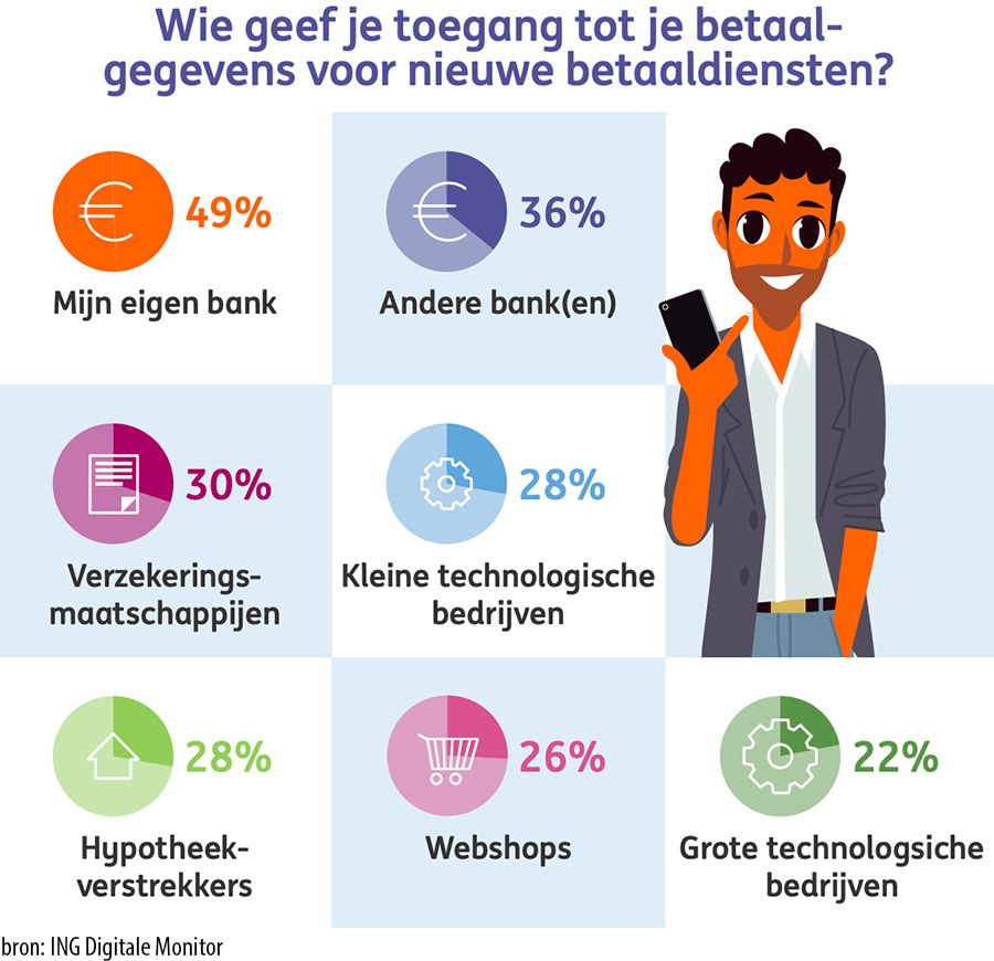 Gevraagd naar de partijen die mensen toegang willen geven tot hun betaalgegevens voor nieuwe betaaldiensten blijken banken met afstand het meeste vertrouwen te krijgen. De eigen bank prijkt bovenaan (49%), gevolgd door andere banken (36%) en verzekeringsmaatschappijen. Deze partijen spelen historisch gezien een rol als geldbewaarder en genieten mede daarom het meeste vertrouwen. Cynici zullen aanvoeren dat er ook in de bankensector genoeg dingen misgaan, maar als het aankomt op een prudente omgang met geld of data scoren ze een stuk hoger dan de Googles en Facebooks van deze wereld. Kleine technologische bedrijven krijgen van 28% het vertrouwen. Dat is enigszins opmerkelijk, omdat dat in essentie de bedrijven zijn voor wie PSD2 mede bedacht is.