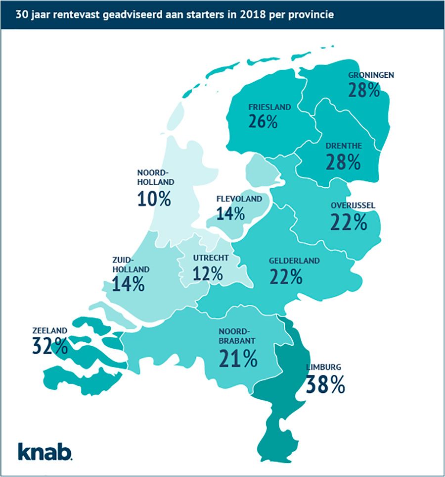 Vooral starters op de woningmarkt hebben de afgelopen jaren gekozen voor lange rentevaste periodes. Een rentevaste periode van 30 jaar was beslist geen uitzondering. Koos in 2016 7% van de starters nog voor de langste optie, in 2018 was dat percentage ruim verdubbeld tot 18%. Uit eigen onderzoek blijkt dat Knab relatief weinig 30 jaar rentevast adviseert vergeleken met de rest van de markt, gemiddeld in minder dan de helft van de adviezen.
