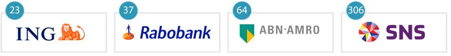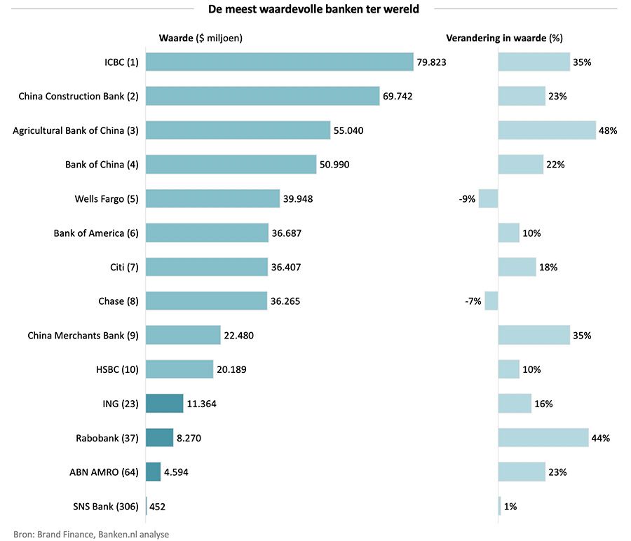 In de lijst met 500 waardevolste bankmerken ter wereld staan vier Nederlandse banken. ING bezet op #23 de hoogste plaats. Ondanks dat ING twee keer negatief in het nieuws kwam - eerst met de salariskwestie rond Hamers en daarna met de witwas-affaire - is de merkwaarde substantieel gestegen. Zo bezien heeft het ING niet beschadigt, al zullen we nooit weten of de stijging misschien groter was geweest als het blazoen volledig smetteloos was geweest. Ook hier geldt weer dat de bank met de hoogste nationale merkwaarde ook de grootste nationale bank is in omvang of andersom. De merkwaardes van Rabobank (#37) en ABN AMRO (#64) zijn ongeveer naar rato kleiner. Rabobank kent wel met afstand de grootste toename in merkwaarde. In een jaar tijd nam de merkwaarde van de coöperatieve bank met 43,8% toe tot $8,2 miljard. De drie grootbanken zijn ook meteen de enige drie Nederlandse banken bij de eerste honderd. Op plaats #306 is er nog een speciale vermelding voor de Volksbank-dochter SNS, de vierde Nederlandse bank in de Banking 500.