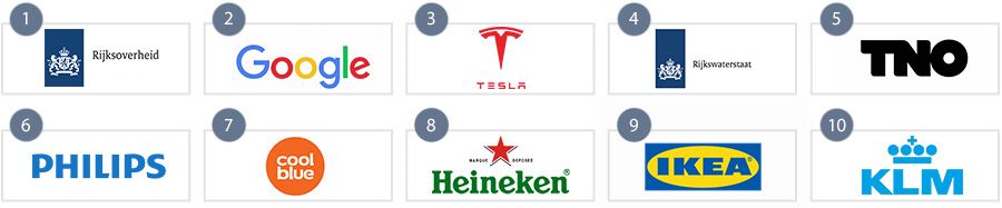 Rest de vraag wie er dan wel allemaal bovenaan staan als het kennelijk niet de banken zijn. Wellicht enigszins verrassend staat de Rijksoverheid bovenaan. Een vaker gehoorde klacht van IT’ers is dat ze bij banken teveel gehinderd worden door legacy-systemen en onwrikbare salarishuizen. Dat zal bij een omvangrijke organisatie als de Rijksoverheid niet veel anders zijn. Wat dat betreft zijn Google en Tesla als nummers #2 en #3 wel ‘usual suspects’.