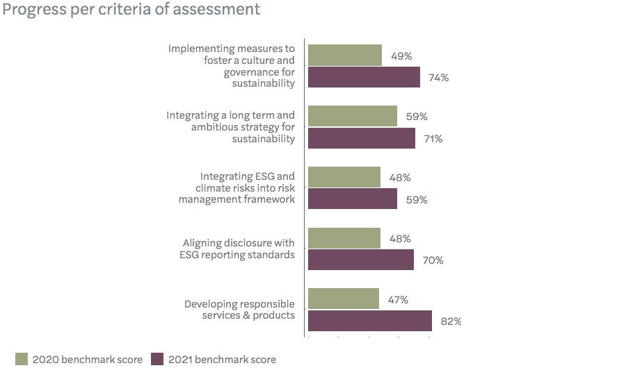 Vergeleken met het onderzoek van vorig jaar scoren banken nu aanzienlijk beter, zo komt naar voren in het rapport van Mazars. Zo is het percentage banken dat een duurzaamheidscultuur hanteert met 51% gestegen en is het aantal banken dat duurzame producten en diensten levert met maar liefst 74% toegenomen.