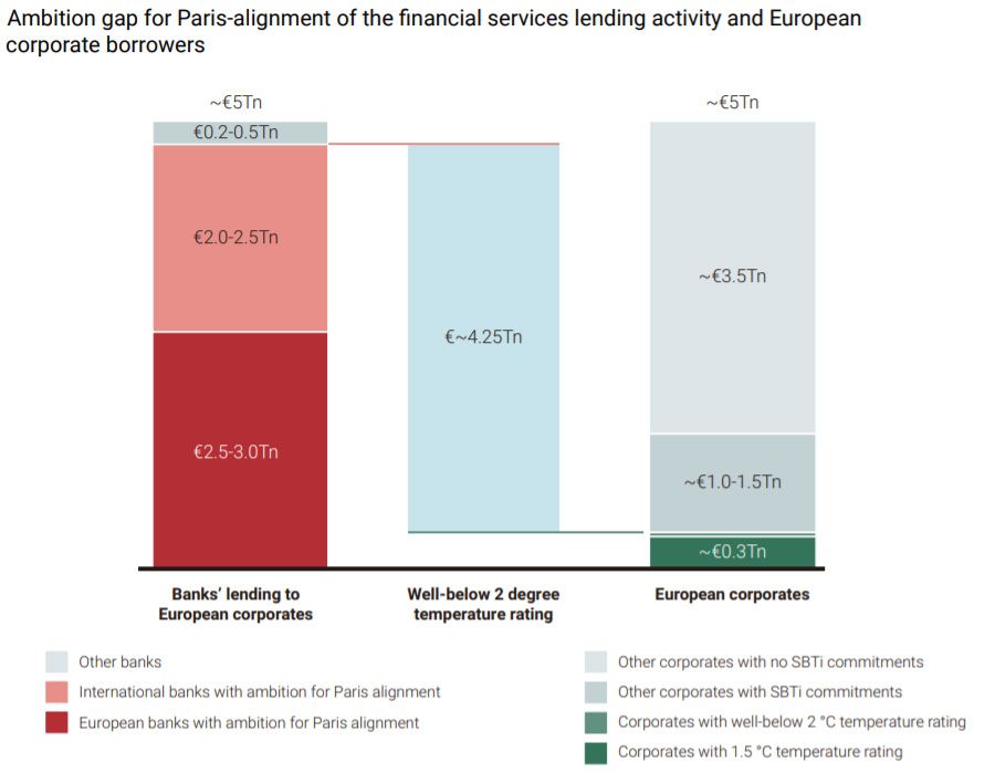 Momenteel beoordeelt niet meer dan de helft van de Europese financiële instellingen of hun klanten of bedrijven waarin ze investeren een strategie hebben die op het Parijs-akkoord is afgestemd. Gerekend vanuit een scenario waarin een ‘geringe versnelling’ optreedt in de inspanningen van bedrijven, zullen financiële instellingen hun kredietportefeuilles met 20-30% moeten aanpassen om de doelstelling van Parijs te halen.