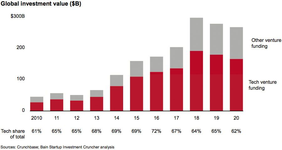 Corporate investeerders en durfkapitalisten investeren steeds vaker in jonge en innovatieve techbedrijven, zo blijkt uit Bain & Company’s ‘Global Technology Report 2021’. Het adviesbureau brengt jaarlijks de belangrijkste trends en ontwikkelingen in de technologiewereld in kaart. Techstartups vormen al jaren een populair jachtterrein, maar de investeringen in de sector bereiken de laatste jaren recordpieken.
