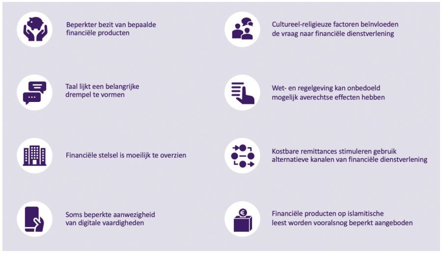 Tevens stelt de toezichthouder dat Nederlanders met een niet-westerse migratieachtergrond minder vaak gebruikmaken van een bankrekening en minder vaak beleggingen aanhouden. De respondenten uit deze groep geven daarbij aan dat de taalbarrière voor hen een belangrijke belemmering vormt voor de toegang tot financiële dienstverlening en producten.
