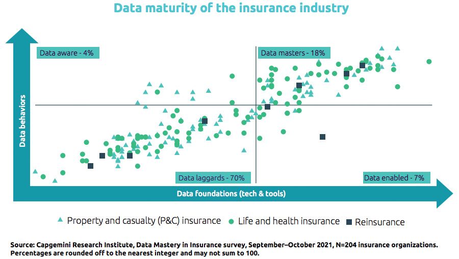 Bovendien heeft 61% van de grote verzekeraars mainstream adoptie verworven of transformationele voordelen geplukt van hun data-initiatieven, vergeleken met slechts 16% van de kleine verzekeraars. Een belangrijke reden voor dit verschil, zou volgens Capgemini kunnen zijn dat kleinere bedrijven te weinig investeren in technologische modernisering, waarbij kleinere verzekeraars vaker dan grote verzekeraars te maken hebben met verouderde legacysystemen en een monolithische architectuur.
