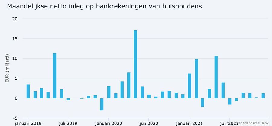 Vanaf maart laten de cijfers van DNB echter zien dat de netto inleg bijna iedere maand kleiner is dan in 2020. Alleen in juni en juli was de inleg hoger dan in 2020, net als in december (toen er wederom een lockdown werd ingesteld). Het grootste verschil is te zien tussen maart en juli. De tegoeden van huishoudens op hun bankrekeningen namen toen toe met €13,9 miljard, terwijl deze in 2020 nog met €30,3 miljard toenamen. De toezichthouder wijt dit verschil aan de versoepeling van de contactbeperkende maatregelen en het daarbij behorende consumptieherstel (en tevens verbeterde consumentenvertrouwen).