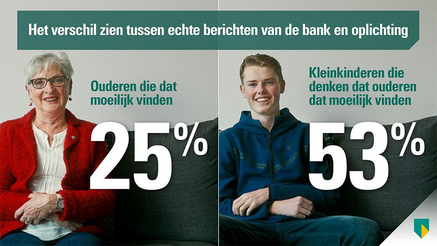 In schril contrast met de zeventigplussers zelf, denken de (klein)kinderen dat ouderen online bankieren juist helemaal niet zo makkelijk vinden als ze beweren. Een meerderheid zegt ook dat hun ouders of grootouders moeilijk het verschil zien tussen berichten van de bank en oplichting (zoals phishing). Kinderen (30%) en kleinkinderen (42%) maken zich daar zorgen over, terwijl ouderen er nauwelijks wakker van liggen (8%).