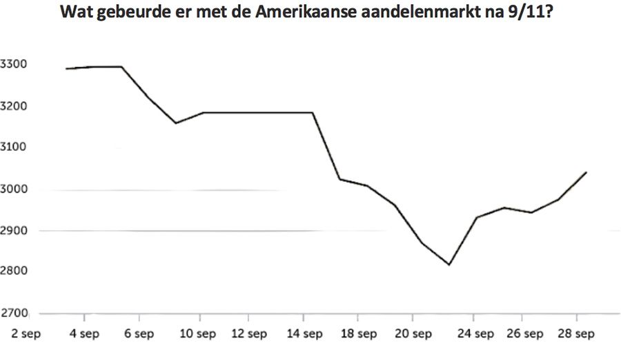 De beurscijfers tijdens (en ná) de aanslagen op het World Trade Center op 11 september 2001 laten vergelijkbare cijfers zien. De Amerikaanse aandelenmarkt verloor in de eerste week zo’n 12,5%. Dat lijkt een flinke klap, maar op de lange termijn stelde die daling volgens de analisten eigenlijk niet zo veel voor. De beurzen werden tijdens de kredietcrisis van 2008-2009 bijvoorbeeld een stuk harder geraakt: aandelen daalden destijds met maar liefst 40%.