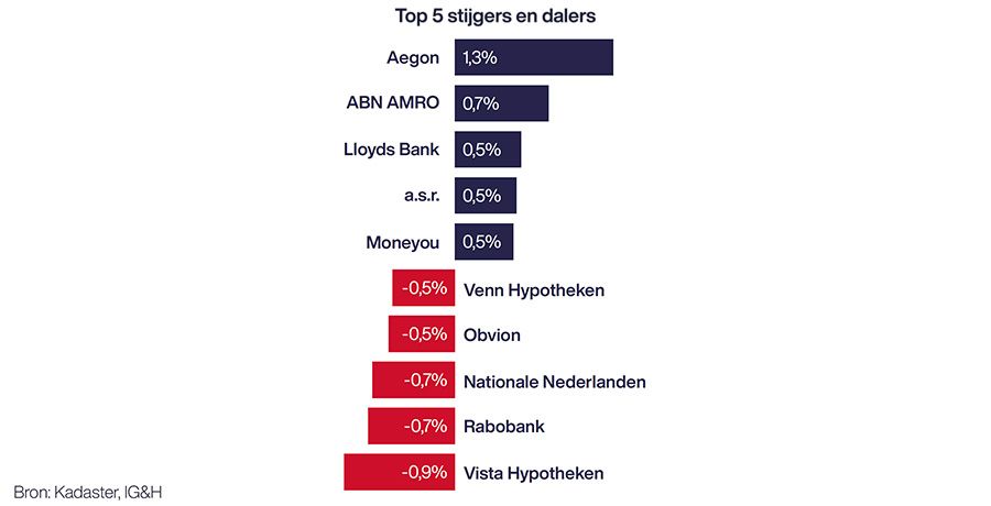 De experts van IG&H wijzen er tot slot op dat maar liefst drie labels van Rabobank tot de top vijf dalers van het kwartaal behoren: Visa (-0,9 procentpunt), Rabobank (-0,7% procentpunt) en Obvion (-0,5% procentpunt). Wel blijft Rabobank nog altijd de grootste hypotheekverstrekker van Nederland.