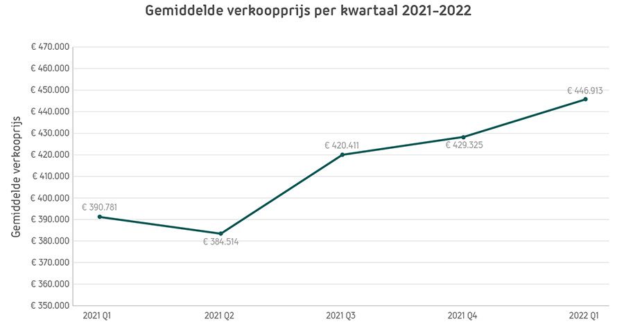 Ook zijn koopwoningen opnieuw duurder geworden. Zo bedroeg de gemiddelde verkoopprijs in het het eerste kwartaal van 2022 € 446.913. Een stijging van 14% ten opzichte van dezelfde periode het jaar ervoor (€ 390.781) en 4% ten opzichte van het kwartaal ervoor (€ 429.325).