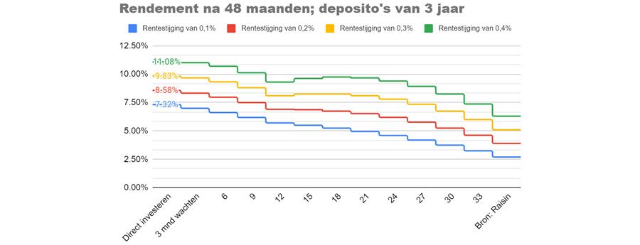 Volgens Raisin.nl is wachten echter zelden de moeite waard, simpelweg omdat je gedurende de tijd dat je wacht geen rente opbouwt.