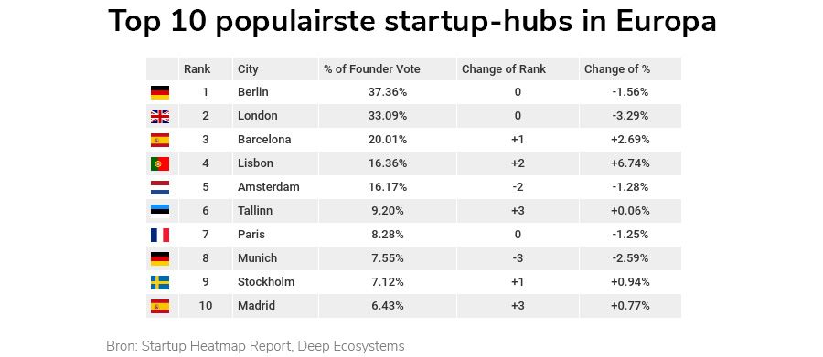 Ook dit jaar staan Berlijn en Londen bovenaan de lijst. Deze steden zijn door oprichters in Europa aangemerkt als de beste steden om hun startup te beginnen. De twee steden worden geroemd om hun ‘bedrijfsvriendelijke regelgeving’, de eenvoudige toegang tot financiering, en hun dynamische startup ecosystemen.