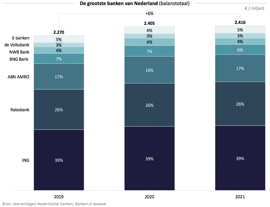 In het afgelopen jaar is het balanstotaal bij negen van de twaalf grootste banken van Nederland toegenomen; bij BNG Bank (-0,7%), NN Bank (-4%) en Achmea Bank (-7%) nam de balans ten opzichte van 2019 juist af. Hoewel het totale vermogen van de Nederlandse bankensector in 2021 licht toenam, kent de top drie van Nederlands grootste banken geen verrassingen: ING, Rabobank en ABN AMRO zijn met afstand de drie grootste banken van Nederland.