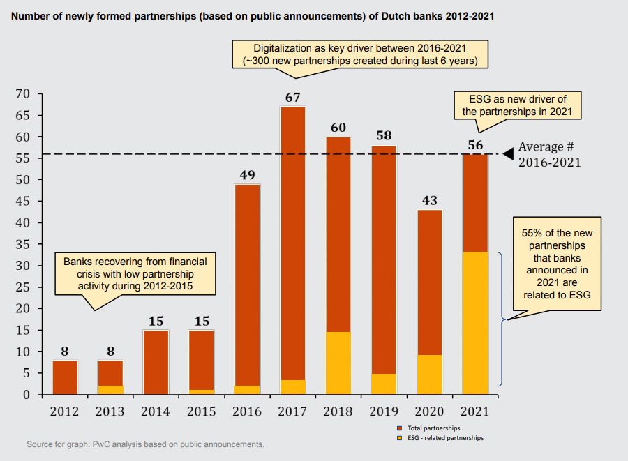 “Tussen 2016 en 2020 was de digitale transformatie van banken de belangrijkste reden voor het aangaan van nieuwe partnerships”, legt Pieter Verheijen (Director Management Consulting en specialist bankensector bij PwC) uit. “Middels partnerships zochten banken naar toegang tot nieuwe technologie en vernieuwing van het dienstenaanbod.” Dit veranderde volgens Verheijen in 2021. “ESG-partnerships voeren sindsdien de boventoon.”