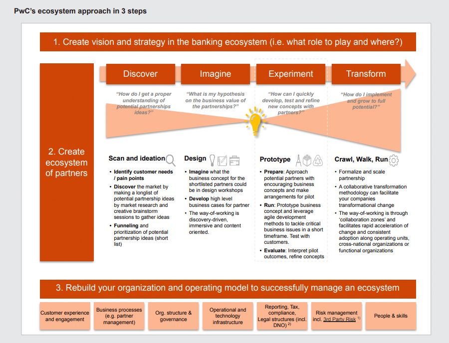 Om op de lange termijn relevant te blijven is het volgens Verheijen voor banken noodzaak om unieke digitale capaciteiten te ontwikkelen en om de juiste partnerships aan te gaan. De PwC analist geeft vervolgens drie tips om banken bij deze zoektocht te helpen. Ten eerste dienen banken hun strategie in het speelveld van de verschillende ecosystemen aan te scherpen én hun partnership-prioriteiten zo duidelijk mogelijk te definiëren.