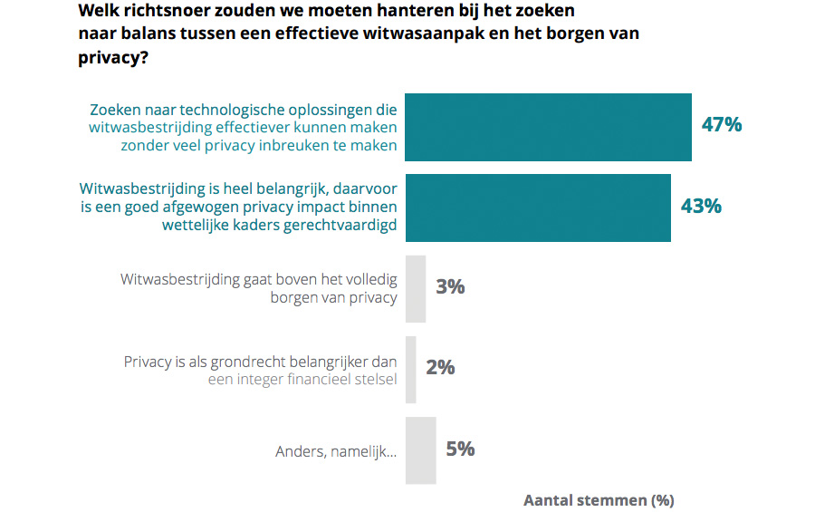 Het rapport laat zien dat de meeste AML-leiders de privacy impact van de huidige witwasaanpak beschouwen als hoog en dat de zorgen van privacy experts terecht zijn. “Onze survey laat zien dat het privacy vraagstuk nog verre van opgelost is”, zegt Van Rooijen. Volgens hem kiest geen van de respondenten een principieel antwoord zoals: ‘Privacy gaat boven witwassen’ of andersom’. “Dus het zal voorlopig wel een balanceeract blijven.”