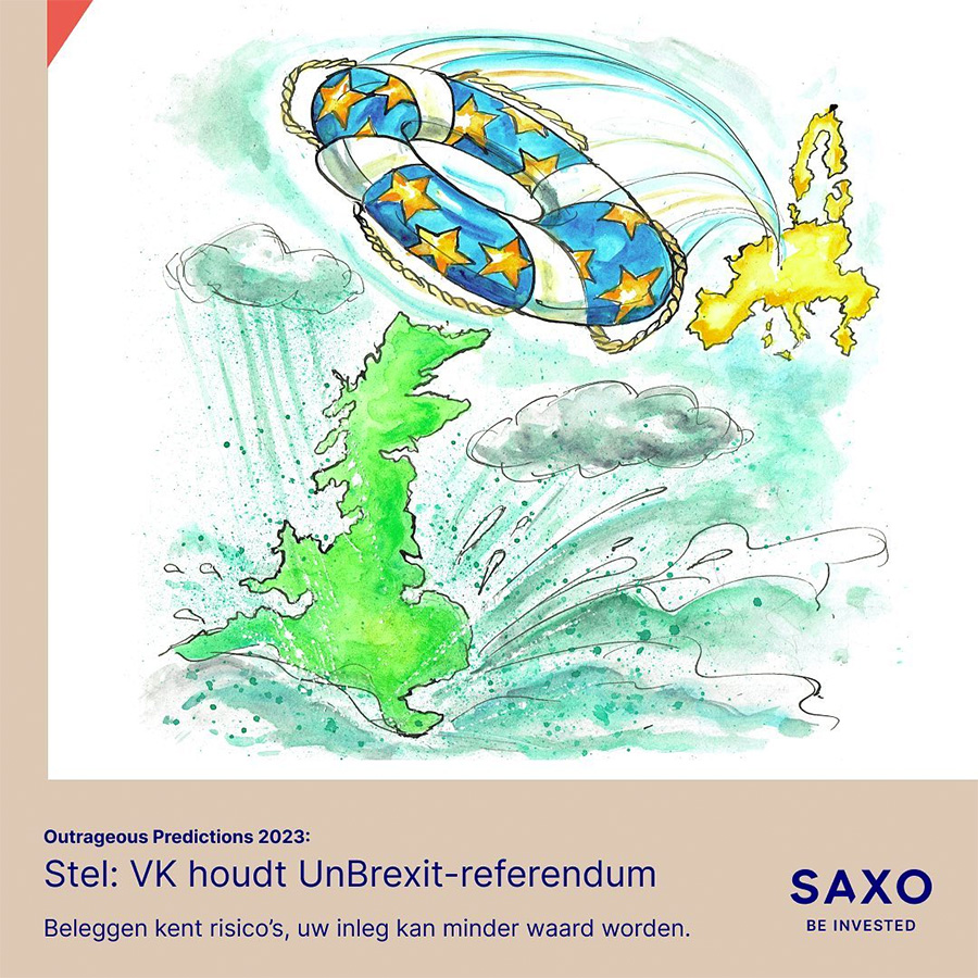 Een outrageous voorspelling van een geheel andere orde is de terugkeer van het Verenigd Koninkrijk in de EU. Saxo voorspelt dat de populariteit van de Tory’s onder leiding van de Britse premier Rishi Sunak verder zal kelderen. Vanwege het ontbreken van een volksmandaat zal Sunak vervroegde verkiezingen uitschrijven. Tegelijkertijd zouden steeds meer Britten zich afvragen of de Brexit wel een goed idee is geweest.