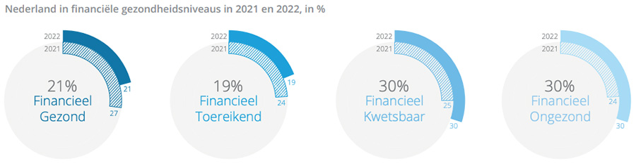 De financiële situatie van Nederlandse huishoudens is het afgelopen jaar verslechterd. Waar in 2021 de Nederlandse huishoudens nog redelijk verdeeld waren over de vier gezondheidsniveaus, steken de financieel kwetsbare en de financieel ongezonde huishoudens er afgelopen jaar uit met beiden 30%. Tegelijkertijd zakte het aandeel gezonde huishoudens van 27 naar 21 procent, terwijl het aandeel financieel toereikende huishoudens daalde van 24 naar 19 procent.