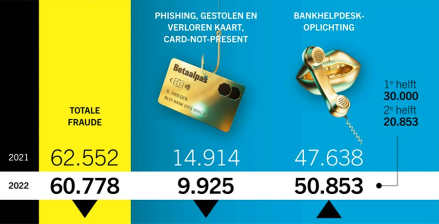 Hoewel de strijd tegen online fraude nog lang niet gestreden is, nam de schade in 2022 wel af met bijna €2 miljoen ten opzichte van 2021 (van €62,5 miljoen naar €60,8 miljoen). De schade als gevolg van phishing daalde met 67% naar €3,6 miljoen. Bij bankhelpdeskfraude daalde het schadebedrag van €30 miljoen in het eerste halfjaar naar €€21 miljoen in het tweede halfjaar van 2022. Hierdoor steeg de totale schade licht ten opzichte van 2021, met 6,7% naar €51 miljoen.