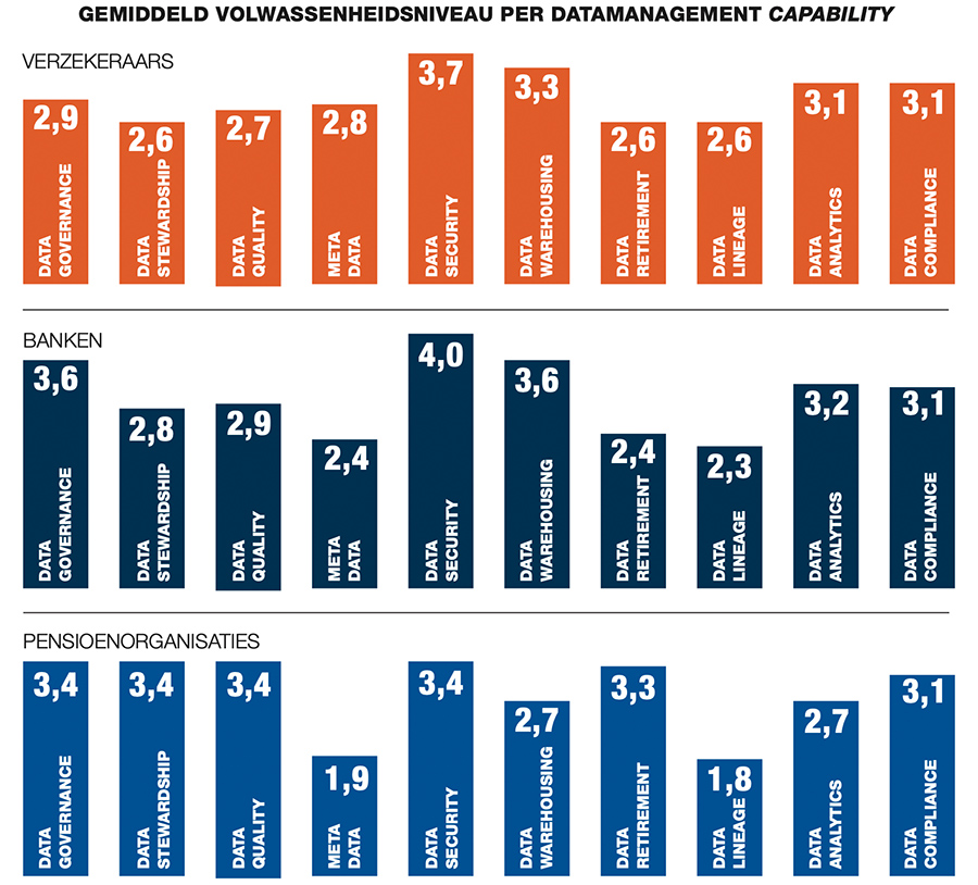 Om in kaart te brengen waar de sector staat met datamanagement, vroeg ITDS dertig experts uit drie segmenten – banken, verzekeraars en pensioenorganisaties – om aan te geven hoe volwassen zij opereren langs zeven dimensies van datamanagement.